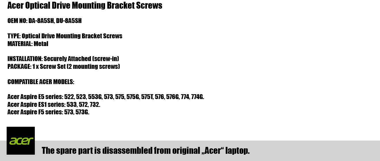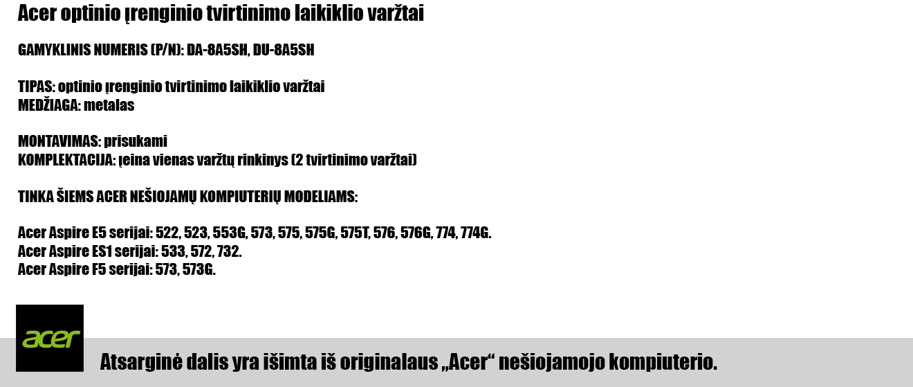 Šiuos „ACER“ gamintojo tvirtinimo varžtus galima pritaikyti ir kitiems elektronikos įrenginiams.