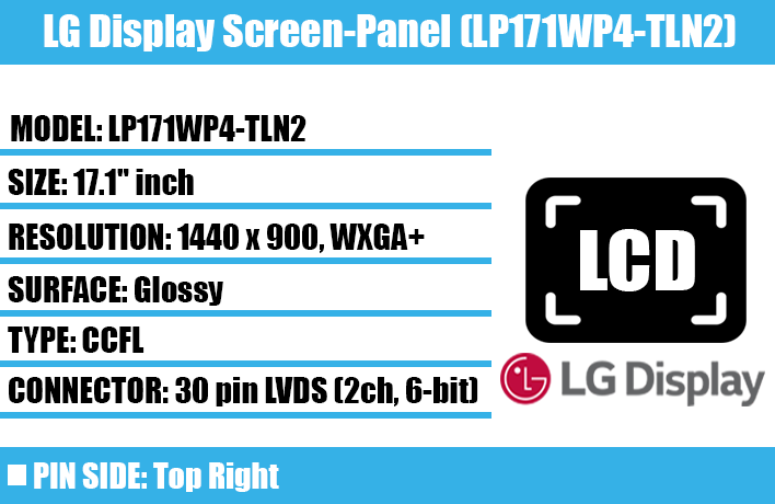 | LG / LG.Philips Display: | LP171WP4-TL01 | LP171WP4-TL02 | LP171WP4-TL03 | LP171WP4-TL04 | LP171WP4-TLA1 | LP171WP4-TLA5 | LP171WP4-TLB1 | LP171WP4-TLB2 | LP171WP4-TLB3 | LP171WP4-TLB4 | LP171WP4-TLB5 | LP171WP4-TLN1 | LP171WP4-TLN2 | LP171WP4-TLP1 | LP171WP4-TLP2 | LP171WP4-TLQ1 | LP171WP4-TLQ2 | LP171WP4-TLR1 | LP171WP4-TLR2 | LP171WX2-A4K9 | LM171W02-TLB2 | LP171W01-A4K3 | LP171WP3-A4 | LP171WP3-A4K1 | LP171WP5-TL02 | LP171WP5-TL03 | LP171WP6-TL01 | LP171WP6-TL03 | LP171WP6-TL04 | LP171WP7-TLA1 | LP171WP7-TLA3 | LP171WP7-TLA4 | LP171WP7-TLB1 | LP171WX2-A4 | LP171WX2-A4K1 | LP171WX2-A4K2 | LP171WX2-A4K3 | LP171WX2-A4K5 | LP171WX2-A4K7 | LP171WX2-A4K8 | LP171WX2-TLA1 | LP171WX2-TLA2 | LP171WX2-TLB1 | LP171WX2-TLB2. |