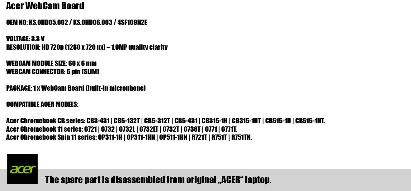 Acer WebCam modulis, 5 pin (SLIM) HD 720p (KS.0HD05002)
