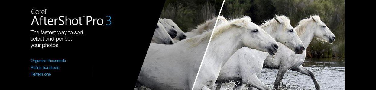 „AfterShot Pro 3“ – ji yra greičiausia nuotraukų redagavimo programinė įranga, kurios priešakyje vaizduojamas arklys, jis atspindi didelį greitį ir paprastumą.