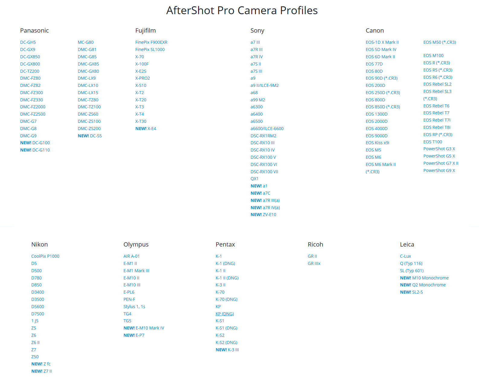 Ir beabejo turi turėti ir visus esamus galimus profesionalių fotoparatų kamerų profilius:„Panasonic“ 30 kamerų profilių / „Fujifilm“ 13 kamerų profilių / „Sony“ 25 kamerų profiliai / „Canon“ 35 kamerų profiliai / „Nikon“ 17 kamerų profilių / „Olympus“ 12 kamerų profilių / „Pentax“ 14 kamerų profilių / „Ricoh“ 2 kamerų profiliai / „Leica“ 6 kamerų profiliai.