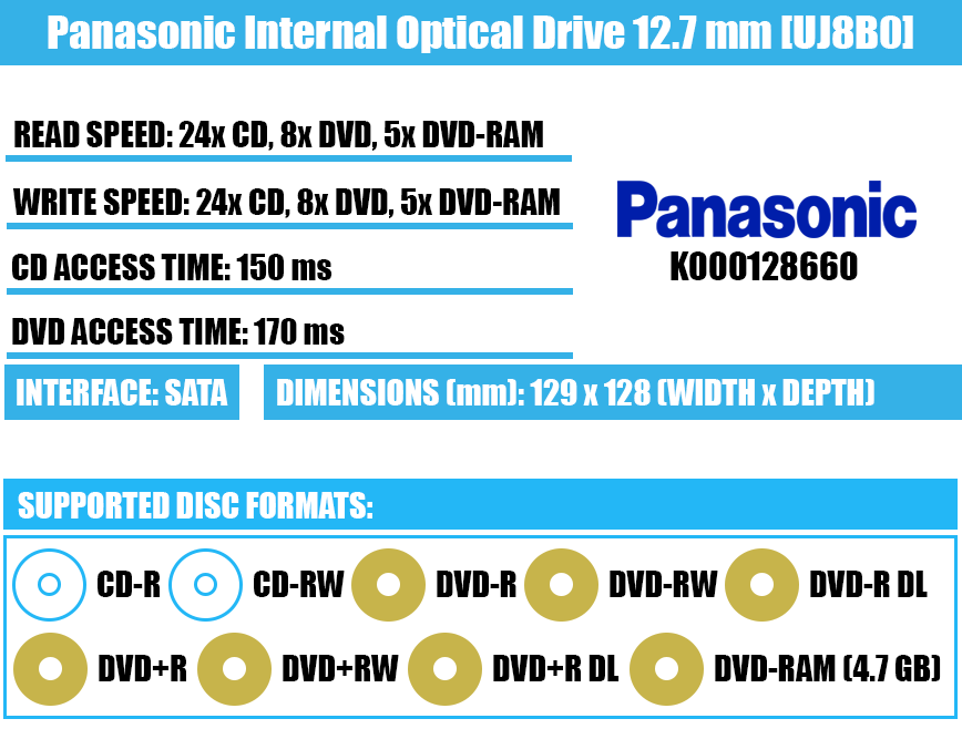 Panasonic gamina savo produktus visose šalyse, taip pat turi ne vieną gamyklą ir Kinijoje. Garsi Japonijos technologijų milžinė turi gamyklų bazes: Čekijoje, Filipinuose, Indijoje, Meksikoje, Vokietijoje ir kt.Optinį įrenginį galima pritaikyti tokiems kompiuteriams kaip ASUS, ACER, DELL, HP, LENOVO, SAMSUNG, TOSHIBA ir kt.